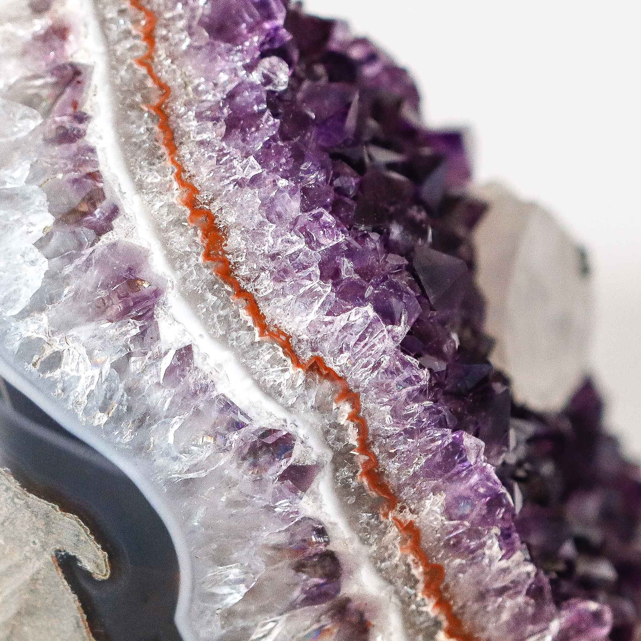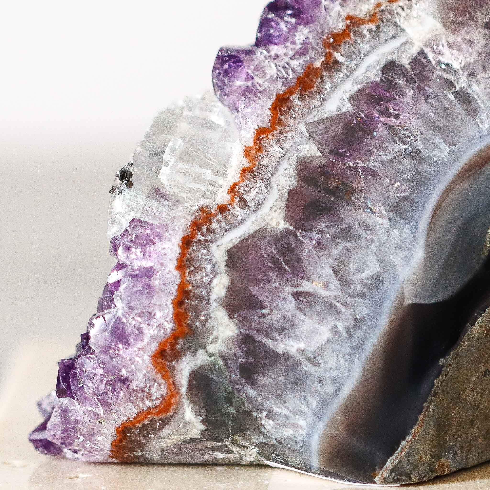 横から眺めると、メノウ・水晶・アメジストが重なる層に、赤いカルセドニーのラインがリボンのように走り、自然がつくり出した圧巻の景色が広がっています。