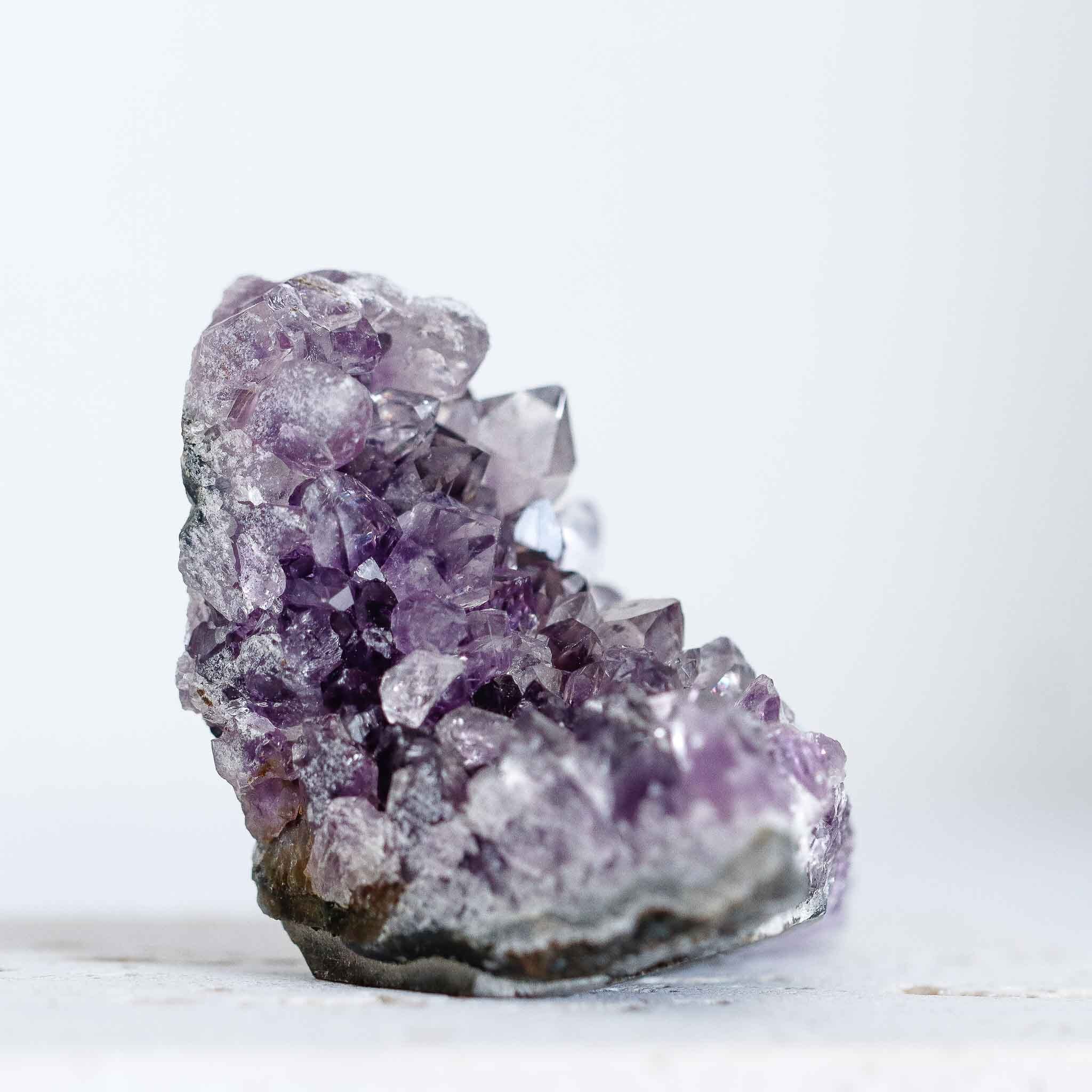 ウルグアイ産アメジストならではの深い紫と、透明へと移ろう結晶の先端が織りなす、眩いほどのきらめき。一つひとつの結晶がしなやかに立ち上がり、光を受けた瞬間に瑞々しい輝きがあふれ出します。