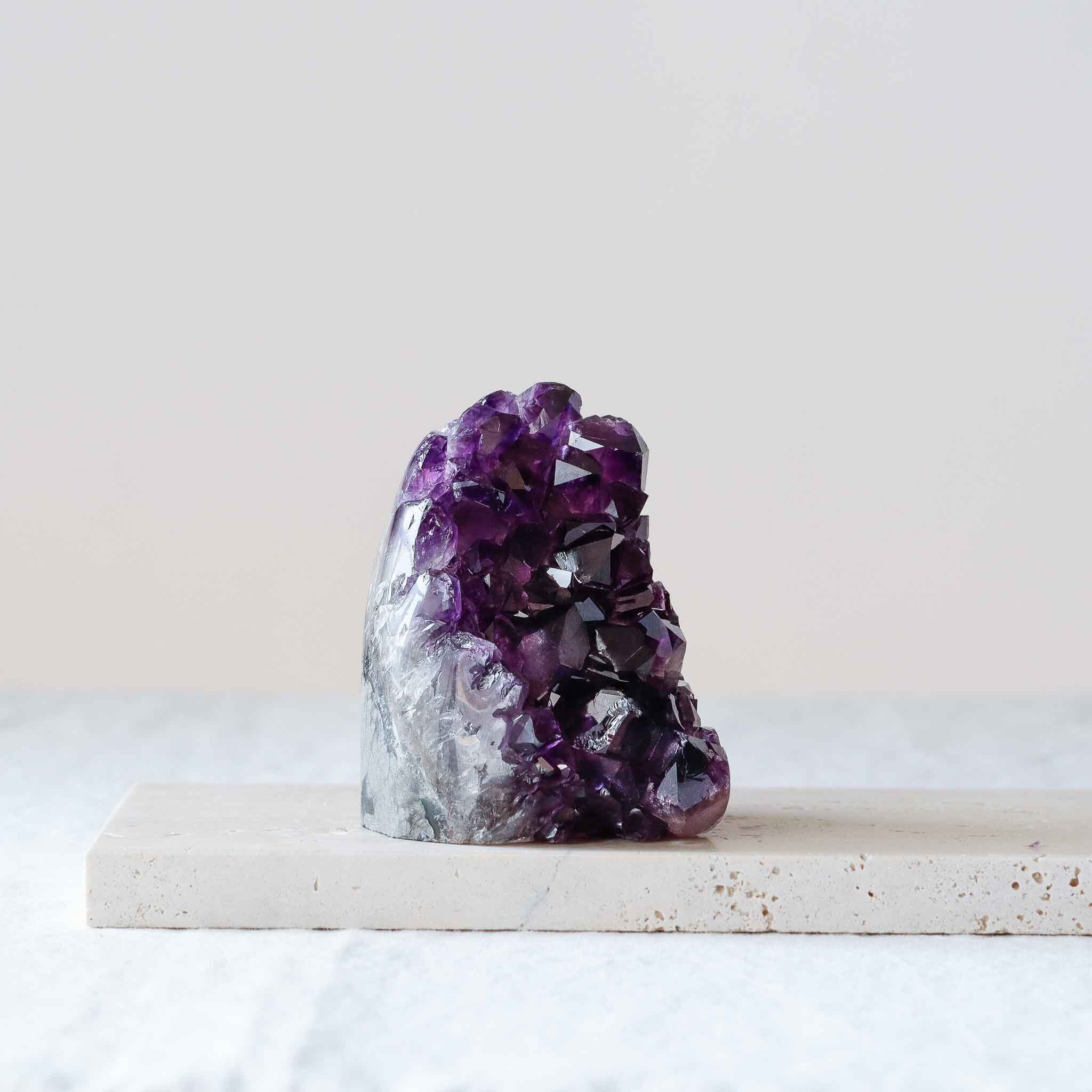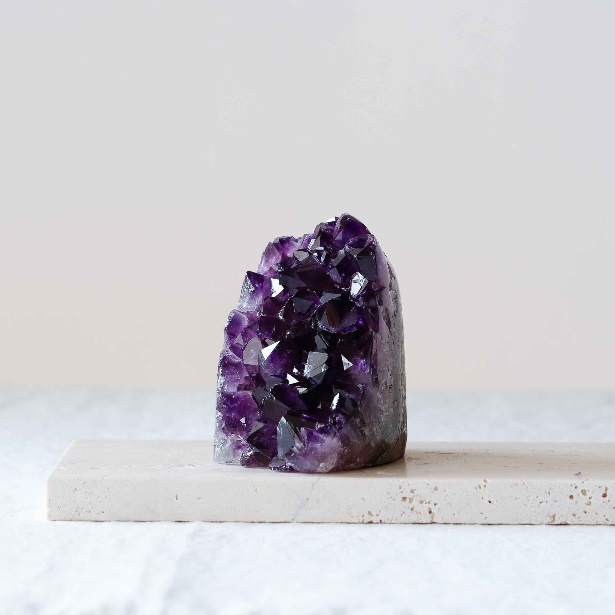和名は「紫水晶」と呼ばれ、その名の通り水晶(石英)グループに属し、主成分である無色透明な石英に微量の鉄イオンが混ざることで美しい紫色に発色します。心身の緊張をほぐし、高ぶった気持ちを静かに落ち着かせてくれる癒しの作用があると、色彩心理学・生理学の観点から知られています。集中力や直感力を高める作用も注目されています。美しいアメジストをクリエイティブや思考作業の空間に、くつろぎの空間に——そこにあるだけで空間をひと際上質に整えてくれます。